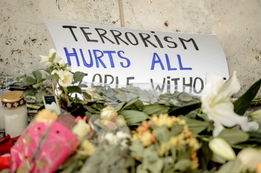 A poster reading "Terrorism hurts all..." is placed on December 21, 2016 at a makeshift memorial near the Kaiser-Wilhelm-Gedaechtniskirche (Kaiser Wilhelm Memorial Church) in Berlin, close to the site where a truck crashed into a Christmas market two days before. Twelve people were killed and almost 50 wounded, 18 seriously, when the lorry tore through the crowd on December 19, 2016, smashing wooden stalls and crushing victims, in scenes reminiscent of July's deadly attack in the French Riviera city of Nice. / AFP PHOTO / CLEMENS BILAN